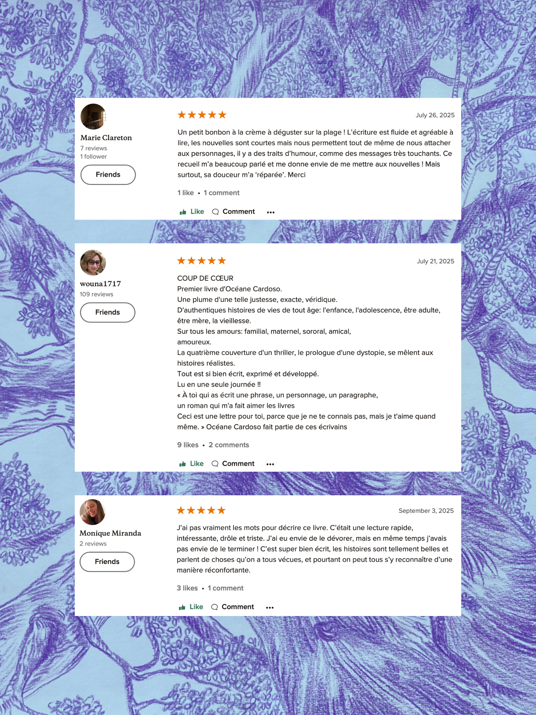 21 histoires. 21 vies. Essayez-en une, laissez-vous porter. Entre deux plongeons dans l'océan, parce qu'il fait bien trop chaud pour rester immobile trop longtemps. Ou même entre deux stations de métro, un mardi ordinaire, à des kilomètres de la mer. J'espère que ce livre, rempli d'histoires avec leur propre rythme et leurs émotions, vous fera vous sentir vivant-e, reconnecté-e, et inspiré-e. Peut-être qu'il vous emmènera ailleurs, ne serait-ce que pour quelques pages.